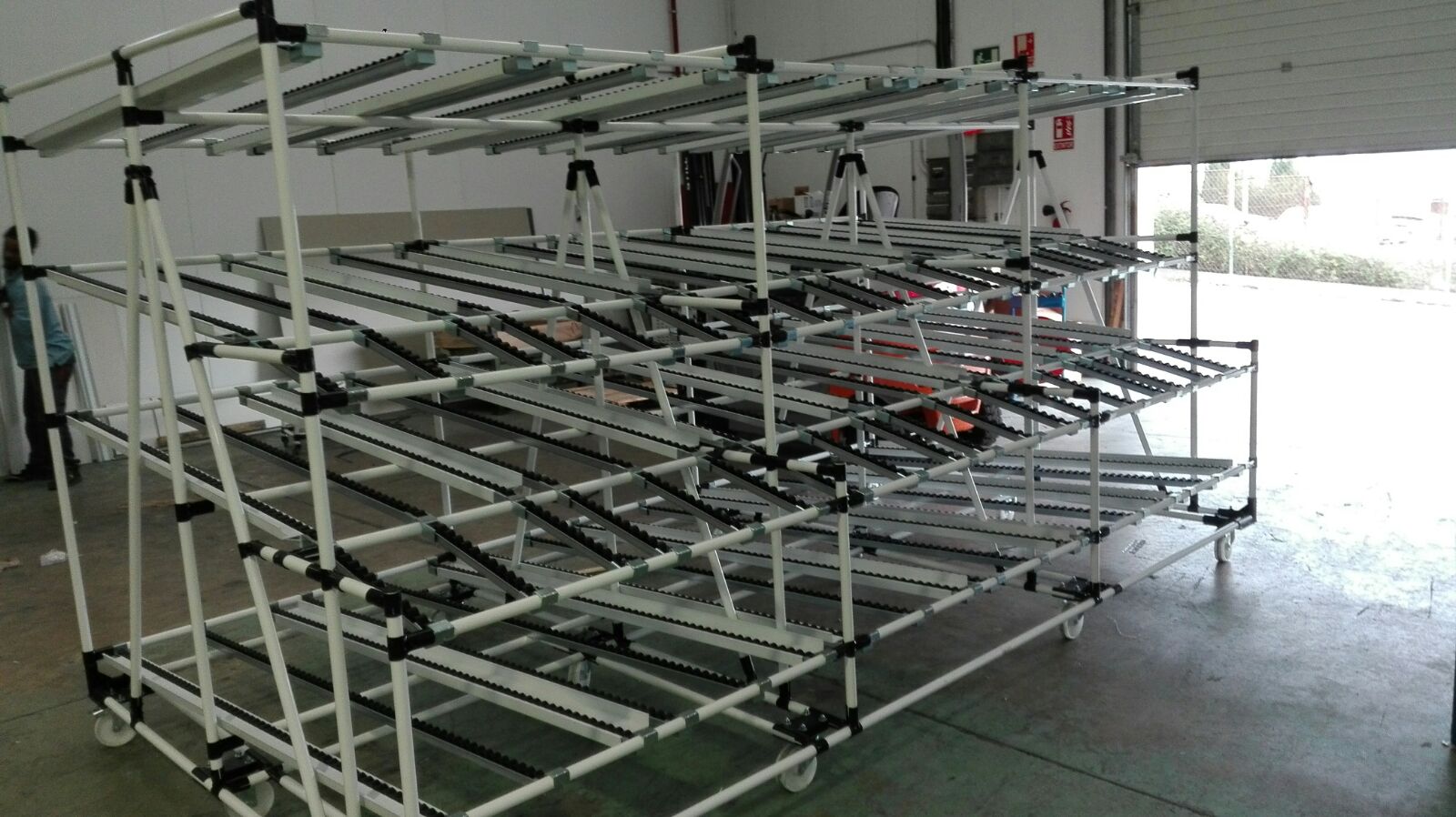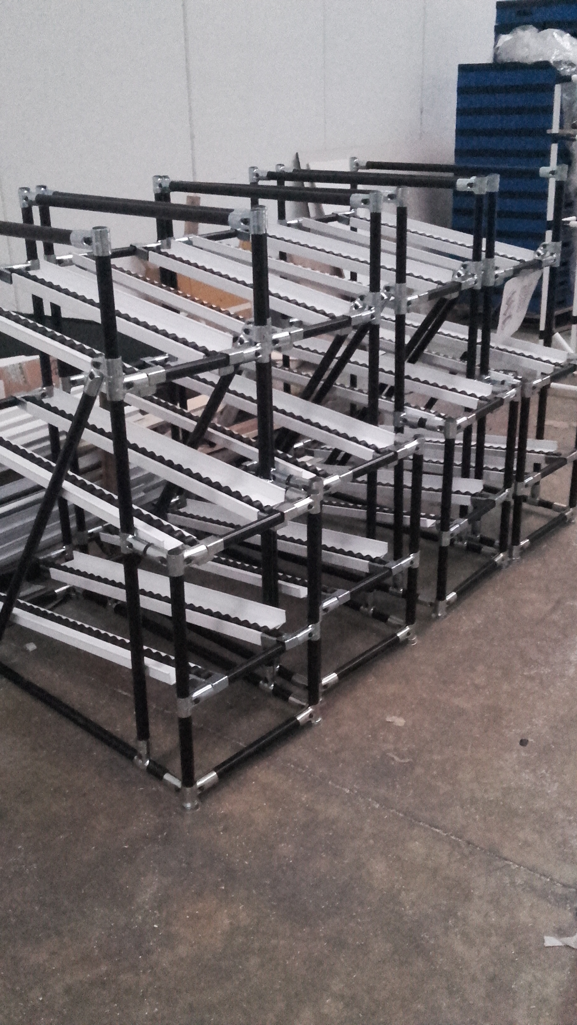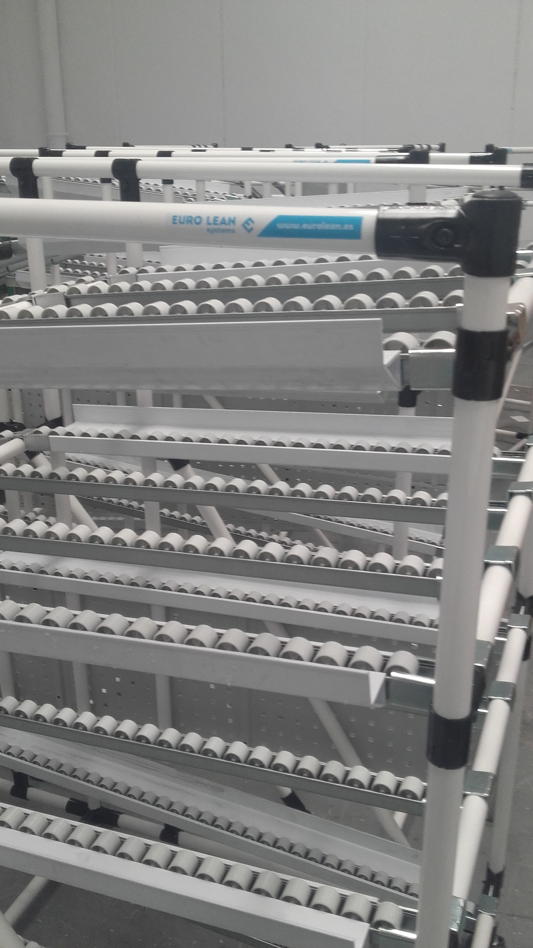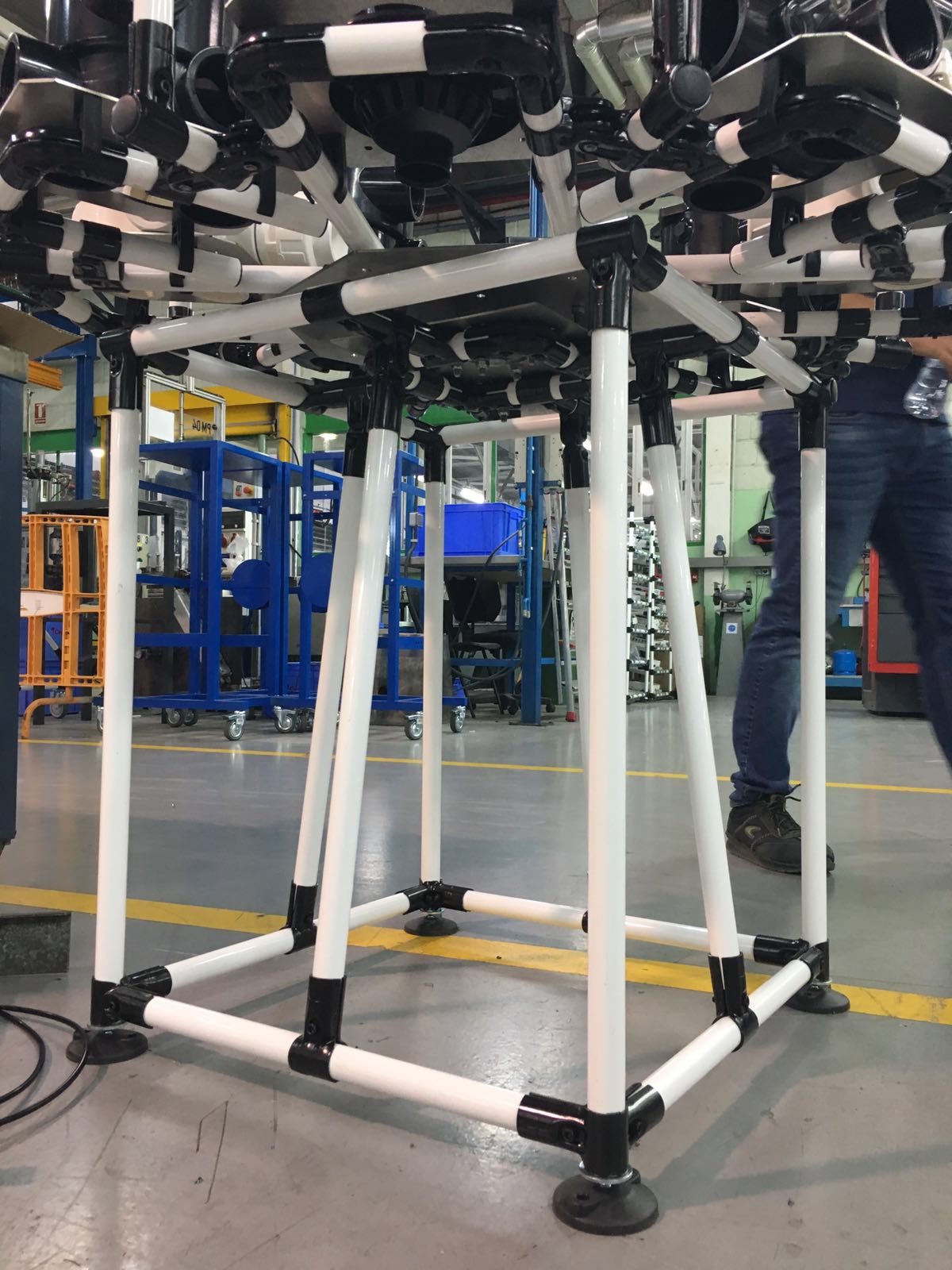 Sistema flexible compuesto por tubo de acero de diámetro 28.2 mm y espesores de 1mm y 2 mm. y juntas rollers y accesorios E-Lean, siguiendo las pautas y directrices del sistema de producción Lean Manufacturing.